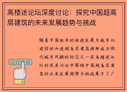 随着中国经济的快速发展与城市化进程的加速,超高层建筑逐渐成为现代城市风貌的标志之一。在高楼迷论坛的深度讨论中,围绕中国超高层建筑的未来发展趋势与挑战展开了广泛探讨。本文将从四个方面深入分析这一话题:首先是技术创新的推动作用,其次是超高层建筑在城市规划中的作用,接着讨论的是建筑安全与可持续发展问题,最后探讨了超高层建筑在社会文化中的影响。每个方面将结合中国超高层建筑的现状与未来趋势,探讨其面临的机遇与挑战,并对相关议题进行深入剖析。通过这些讨论,我们能够更好地理解超高层建筑在中国城市发展中的独特地位与未来发展方向。